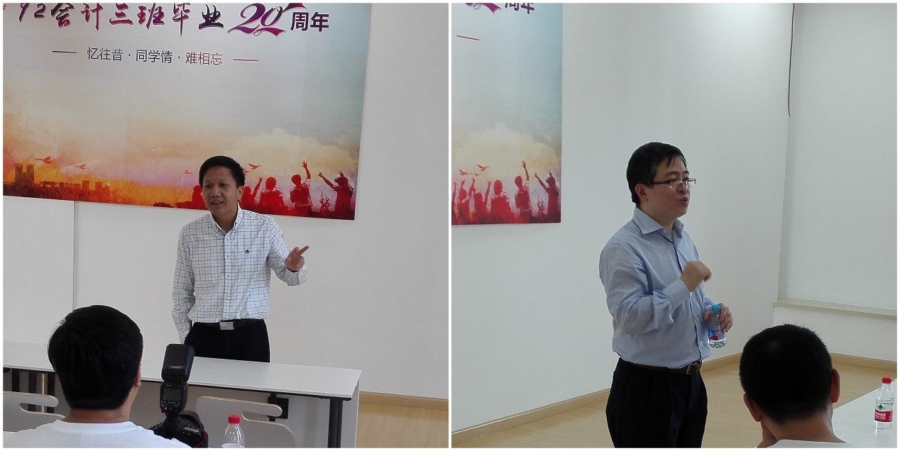 上海财经大学副校长陈信元老师、会计学院党委书记周国良老师也出席了与校友的见面会,回顾一起走过的时光,展望学院未来的发展。陈信元老师回忆起他们当时上课的情形,一时间教室中萦绕着温馨的气氛,久违的亲切感扑面而来。接着,陈老师又谈起了自己从他们毕业后至前年主持会计学院(系)工作的经历,以及在这个过程中他所付出的努力和做出的贡献。忆往昔情怀悠悠,展未来信心满满。陈老师最后谈及学校当前的概况以及未来的发展思路等等,美好的蓝图引得大家一次次鼓掌。然后,周国良老师也回忆了自己在会计学院的工作经历,并谈起了会计学院的现今状况和发展思路。阔别多年的母校在两位老师的语言里熠熠生辉,这20年里的精彩在脑海中如电影般回放,令校友们激动不已。