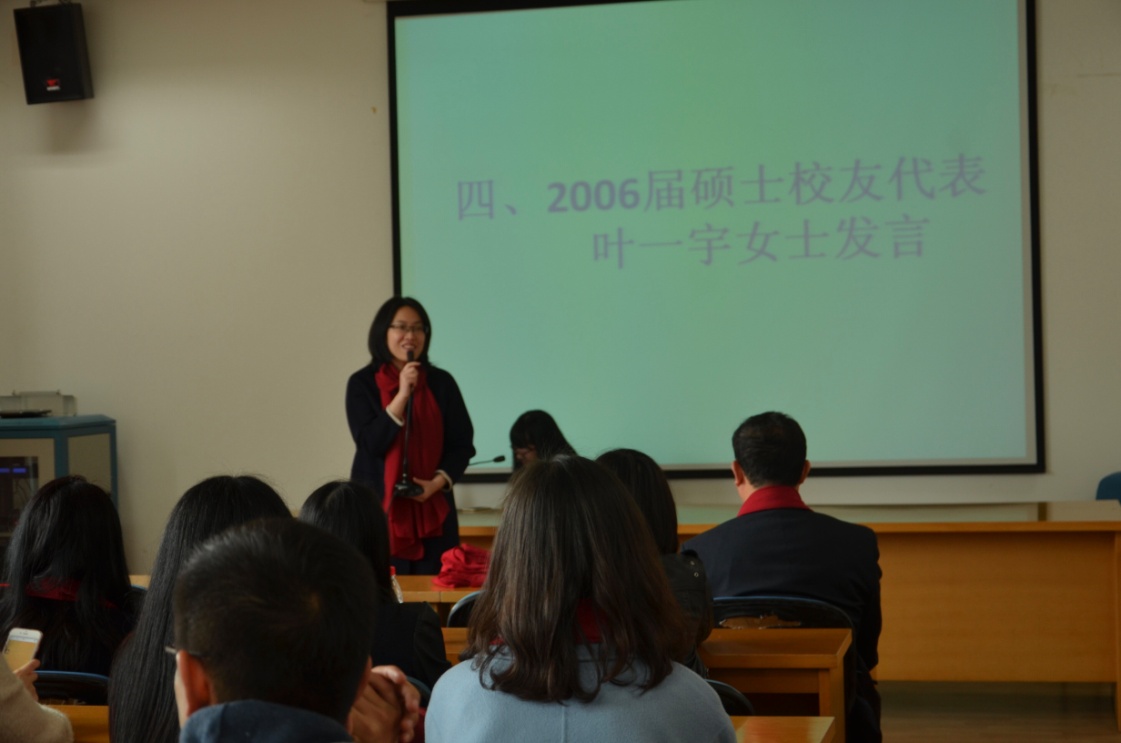 最后,校友代表叶一宇女士发言,她代表校友表达了对母校培养的感激之情,并表示以后要常回来看看,常在一起相聚,并祝母校和母院的发展越来越好。