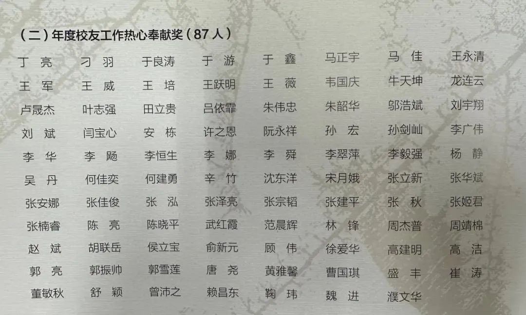 李尊农校友获“2023年度校友工作突出贡献奖”邬建辉校友获“2023年度捐赠支持校友工作突出贡献奖”,李恒生、盛丰、鞠玮三位校友获“2023年度校友工作热心奉献奖”。