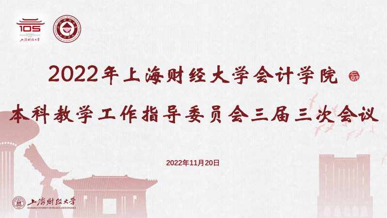 2022年11月20日,上海财经大学会计学院本科教学工作指导委员会三届三次会议以线上线下相结合的形式在上海财经大学中山北一路校区顺利召开。富国基金总经理陈戈、新华医院副院长程明、上海哔哩哔哩科技有限公司首席财务官樊欣、百联集团首席投资与金融官谷峰、普华永道中天会计师事务所首席合伙人李丹、恒产投资顾问有限公司行政总裁钱亮、上海朴易资产管理有限公司董事长尚志强、毕马威中国证券基金主管合伙人王国蓓、德勤审计合伙人徐璐、南通通易航天科技股份有限公司董事长张欣戎等10位教指委委员出席本次会议。上海弘信股权投资基金管理有限公司执行董事&CEO高建明、国泰君安研究所所长黄燕铭、容诚会计师事务所首席合伙人肖厚发等5位教指委委员及会计学院校友代表通过线上会议形式参会。上海财经大学副校长陈信元、副校长李增泉,会计学院领导班子、教师代表等9人共同参会。会议由会计学院党委书记周国良主持。