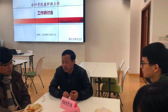 2018年12月27日中午,会计学院兼职班主任工作研讨会在学院108教室顺利举办。学院17、18级十余位兼职班主任和17、18级二十多位学生代表以及辅导员参加会议,会议由学院党委副书记黄莎老师主持。
