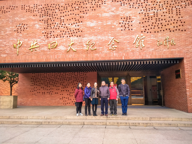 首先进入序厅,整块墙面运用现代科技呈现出巨大的党旗式样,飘扬的党旗前方,革命士兵、知识分子、工人、农民和妇女的雕塑形象栩栩如生,大厅两侧则是连贯的浮雕壁画,展示了五四运动等重要史实。就在这个气势恢宏的序厅中,在红艳艳的巨幅党旗面前,会计学院10多位教工党员和学生党员怀着激动的心情,高举右手、铿锵有力地重温了一遍入党誓词,并在鲜艳的党旗下,全体合影留念;宣誓完毕后,进入主题为“时局与形势”的第一展厅,这里陈列了许多珍贵的史料,一方面反映了国共联合、开创革命新局面的历史,另一方面也反映了国共两党的斗争。通过参观,党员们认识到中共“四大”会议的主要内容和重大历史意义;紧接着,大家步入了第二展厅。通过仔细阅读一份份珍贵的信件、手稿、报刊文章和照片,参观者强烈地感受到瞿秋白等中共与会代表的风采和他们心中信仰的力量。1925年1月11日至22日召开的中共四大总共有20位正式代表,其中不少人在之后的革命斗争中大义凛然地献出了生命。党员们在介绍各位代表的电子资料屏前久久驻足,仔细翻看每位党员代表的经历和资料,为他们的信仰之坚定而动容,久久不愿意离去。参观结束后,部分教工党员又在中共“四大”纪念馆门口合影留念。