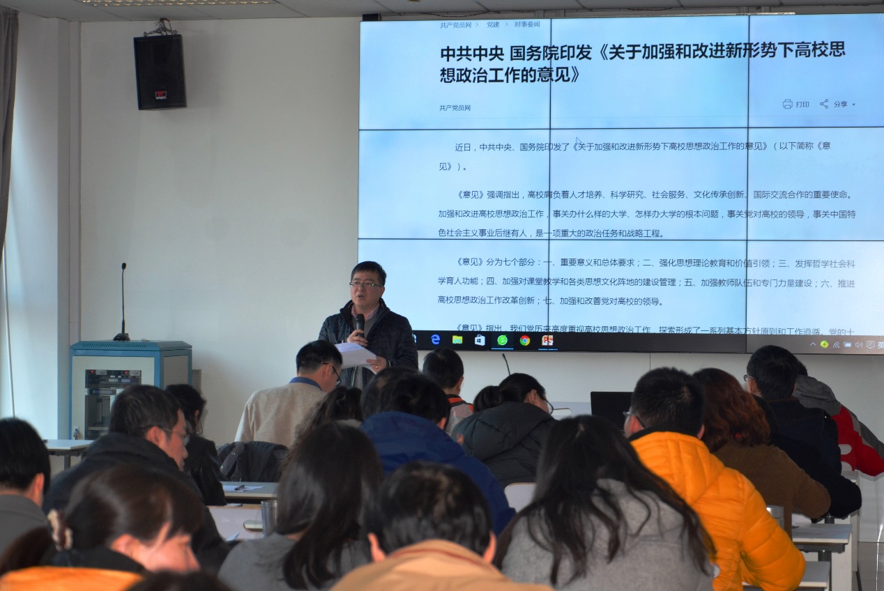 会议伊始,党委书记周国良向全院教师传达了《意见》的主要内容,并就“加强对课堂教学和各类思想文化阵地的建设管理”、“加强教师队伍和专门力量建设”、“推进高校思想政治工作改革创新”、“加强和改善党对高校的领导”等方面进行了重点解读。周国良强调,高校教师必须牢记加强和改进高校思想政治工作的基本原则,即:坚持党对高校的领导,坚持社会主义办学方向,坚持全员全过程全方位育人,坚持遵循教育规律、思想政治工作规律、学生成长规律,坚持改革创新。