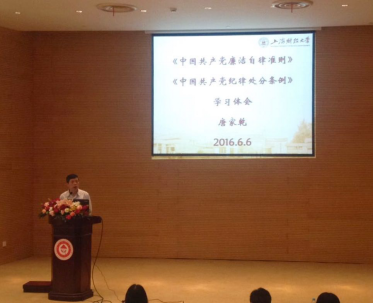 唐家乾老师主要从《中国共产党廉洁自律准则》、《中国共产党纪律处分条例》两部法规修订的背景情况和两部法规修订的主要亮点两个方面,介绍了修订两部法规的原则、必要性和简要过程,对《准则》、《条例》的内容具体解读,同时结合近几年加强党内监督的具体事例与会计学院师生党员交流了自己的心得体会。在党长期执政和全面依法治国条件下,全面从严治党,必须围绕坚持党的领导这个根本,依规依纪治党,解决管党治党方面存在的问题,切实加强党内监督。在介绍《准则》、《条例》两部法规修订时,唐家乾老师讲到新修订的两部法规坚持依规治党与以德治党相结合,坚持高标准与守底线相结合,同时介绍了新修订《中国共产党廉洁自律准则》五大亮点,分别是紧扣“廉洁自律”、坚持正面倡导、面向全体党员、突出“关键少数”、删繁就简,适合全体党员践行。除了对《条例》和《准则》的内容进行了深入而具体的解读之外,唐家乾老师结合实际介绍了新的《中国共产党纪律处分条例》,新《条例》将原《条例》规定的10类违纪行为整合为违反政治纪律、组织纪律、廉洁纪律、群众纪律、工作纪律、生活纪律6类违纪行为,强调纪法分开和纪严于法。
