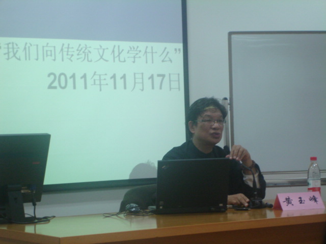 2011年11月17日18:30,会计学院党员助理团与学生会在武川路会计学院大楼108室成功举办了复旦附中特级教师黄玉峰教授的讲座。90多位党校积极分子和党员同学出席了本次讲座。讲座的开始,黄玉峰老师首先提出了他的主题——与财大青年谈“我们向传统文化学了什么”,并用先前社会上轰动一时的“深圳杨武案”引入该话题,同时针对社会上其他一些热点问题进行了详细的点评和介绍。接下来,黄老师从社会过渡到传统文化,向同学们展示了许多中国常见汉字的写法和内涵。如“常”,“根”,“孝”等汉字,并针对其演变的过程向我们介绍了他们更深层次的文化含义,还对当代大学生提出了“发扬中国传统美德”的号召。值得一提的是,黄老师在接下来介绍“和”、“斗”、“争”、“静”这些汉字之时,谈到了一种“沉淀”的人生态度并把它推荐给了在场的同学。其后,他向同学展现了一些中国早期文革反右时的图片,结合历史,声情并茂地加以论述,提出了“自由成长,为人宽容”的结论,让大家的心灵再一次受到了纯净的熏陶。最后,同学们踊跃提问,对本次讲座的内容和社会热点提出了自己的建议。通过本次讲座,同学们的知识和修养得到了较大的提升,对中国汉字的认识也是百尺竿头、更进一步。虽然本次讲座已经落下帷幕,但它对于同学们对生命和道德的理解一定影响深远。