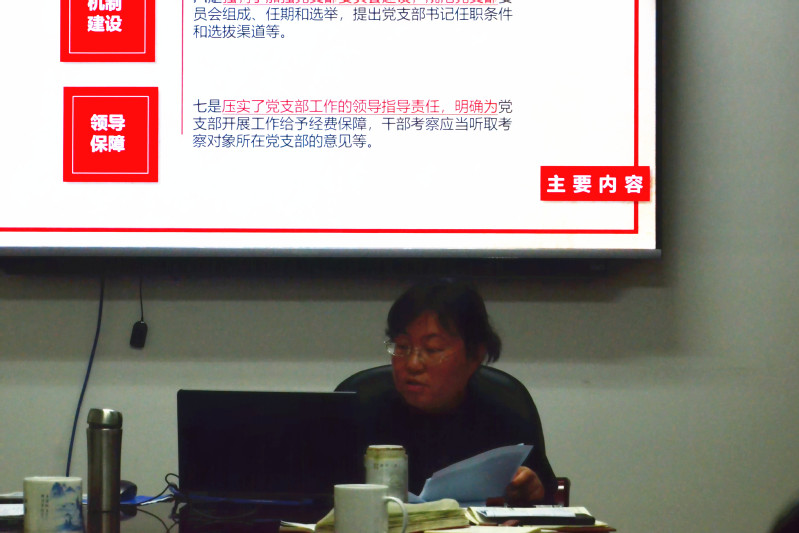 学院党委副书记黄莎给大家讲解《中国共产党支部工作条例(试行)》的内容及《条例》出台的背景:《条例》共8章37条,全面覆盖了党支部建设的各领域、各方面。一是明确了党支部的功能定位,二是规范了党支部的设置,三是提出了党支部的基本任务和不同领域党支部的重点任务,四是完善了党支部的工作机制,五是规定了党支部的组织生活,六是强调了加强党支部委员会建设,七是压实了党支部工作的领导指导责任。可以说,《条例》的出台,为进一步加强党的全面领导,弘扬“支部建在连上”的光荣革命传统,切实落实党要管党、全面从严治党,全面提升党支部组织力,强化党组织政治功能,充分发挥党支部战斗堡垒作用指明了行动规范,奠定了坚实基础。