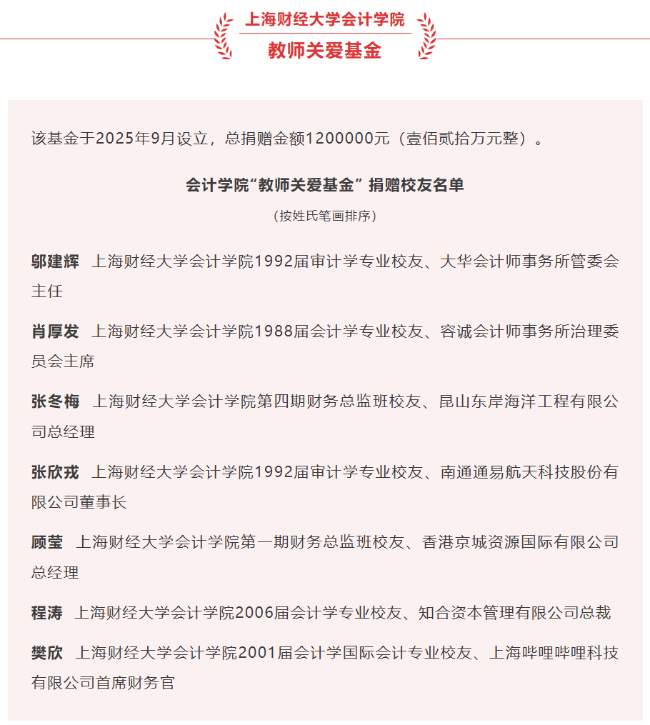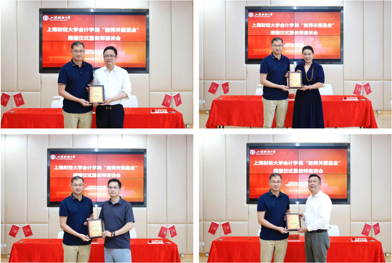 仪式伊始,上海财经大学会计学院院长靳庆鲁致欢迎词。他代表学院对各位捐赠校友和学校领导的到来表示热烈欢迎与衷心感谢,详细介绍了会计学院近期人才培养、师资队伍、学科建设与科研成果等方面的发展情况。他谈到,教师是学院发展的核心力量,“教师关爱基金” 的设立,不仅是校友对学院教师成长的深切关怀,更是对学院教育事业发展的有力支持,为学院吸引和留住优秀人才、激发教师工作热情注入新的动力。 随后,会计学院“教师关爱基金” 发起人、上海财经大学校友工作顾问委员陈晓东发言。他深情回顾了学院发展历史,表达对全体教师的关心关怀,并介绍了基金的设立背景与过程。他表示,在多年的校友工作中,深刻感受到广大校友对学院的深厚情谊,也深知教师在教书育人过程中的辛劳与付出。设立 “教师关爱基金”正是为了搭建一个校友反哺母校、关爱教师的平台,让教师们在辛勤工作的同时,能感受到来自校友和学院的温暖与支持,从而更安心地投身于教育教学工作。最后衷心祝愿所有捐赠校友的事业蒸蒸日上、前程似锦,期待这份善举为教育事业的发展注入源源不断的动力。 陈红梅秘书长与捐赠校友邬建辉、张冬梅、张欣戎、顾莹一同完成会计学院“教师关爱基金”捐赠签约仪式。 陈红梅秘书长对基金的设立给予高度肯定,对捐赠校友与基金发起者表达感谢。她谈到,学校基金会始终致力于搭建社会力量支持学校发展的桥梁,此次全校首个“教师关爱基金”的设立,是校友与学校、学院深度合作的又一典范,为学校公益事业发展注入了新的活力。她表示,基金会将严格按照基金管理规定,确保资金规范运作,确保善款用在实处,及时反馈使用情况。 李增泉副校长为捐赠校友代表颁发会计学院“教师关爱基金”捐赠证书。 随后,捐赠校友代表依次发言。 邬建辉校友谈到,学院发展关键在于教师队伍建设。他表示,自身成长与职业发展受益于老师的传道授业解惑,面对数智时代下财经领域的新挑战,校友们也愿意为教师成长发展赋能,助力学院夯实育人根基。同时,他呼吁校友工作要进一步下沉到年轻校友群体,深度挖掘潜力校友资源,为学院发展注入持续动力。 张冬梅校友表达了对老师们的崇高敬意。她回忆道,求学期间得益于老师的言传身教,自己不仅系统掌握了会计专业知识,更全面提升了企业管理能力。她表示,此次参与教师关爱基金建设,希望以实际行动回馈母校与老师们的培养之恩。 张欣戎校友深情回忆在上财的学生时代。他提到,求学时积极参加学生工作和校园活动,让自己与母校和老师们建立了深厚情谊。同时,他结合自身企业经营实践与相关发展趋势,分享了对财经人才培养的洞察,并对学院学科专业前景表达了充分信心。他表示,作为校友,将持续关注学院发展,尽自己所能贡献力量。 顾莹校友回顾了在上财的读书时光,以及多年来在香港的工作经历与行业现状。他坦言,当年抱着对财经管理知识的渴求来到上财学习,老师们的精湛讲授使自己收获良多,不仅提高了财经专业能力,更收获了浓浓的师生情谊。他表示,对母校和老师的培养始终心怀感激,未来也将继续为学院发展提供力所能及的支持。 学院教师代表先后发言。 薛爽老师代表全体教师,对校友们的爱心捐赠及对老师们的关心关怀表达诚挚感谢,并向校友们送上美好祝福。她谈到,校友的爱心捐赠充分体现了校友与学院之间的良性互动,这份反哺之心将激励老师们坚守教育初心,以全方位、全过程的悉心指导,助力学生全面发展和健康成长。 董雅姝老师认为,“教师关爱基金”的成立让她充分感受到了尊师重道的传统美德,感受到被关爱和被看见,内心备受鼓舞。她坦言老师们日常面临工作和生活的多重压力,校友传递的这份关爱为教师群体注入了更多信心和力量。她表示,将把这份关爱传递给家人、同事和学生,同时向所有校友、前辈及为基金成立付出努力的老师们致以谢意。 董宣君老师向校友为学院教育教学、青年教师关爱等项目慷慨捐赠的校友表示感谢,她表示,校友的支持为学院教师发展注入了重要力量。她坚信,教育不是单向付出,而是师生同心同向的双向奔赴。她表达了对于会计行业高质量发展的坚定信心,表示将始终坚守教育初心,潜心钻研教学,为培养更多优秀会计人才贡献自己的力量。 上海财经大学高级会计审计学院院长陈信元表示,教师是教育事业的基石,肩负着教书育人、科研创新的重任。此次基金的设立从教师成长需求出发,为教师发展提供了坚实的后盾,既为教师们带来更多切实关怀,更能让大家更安心地投入教学和科研工作中,为教育事业发展注入新动力。他相信在校友们的大力支持下,会计学院师资队伍必将焕发更强活力,为培养数智新财经人才、推动学科高质量发展奠定更坚实的基础。 最后,上海财经大学副校长、基金会理事长李增泉作会议总结。他首先对学校首个 “教师关爱基金” 的顺利设立表示祝贺,并对各位捐赠校友 的积极响应、慷慨解囊,以及长期对学校教育事业的支持表示衷心感谢。结合自己在会计学院学习和工作的经历,他谈到,会计学院始终以学生发展需要为人才培养的出发点,持续推进前瞻性的教育教学改革和研究范式变革,推动教师以科研反哺教学,不断提升教育教学水平和人才培养质量。多年来,学院培