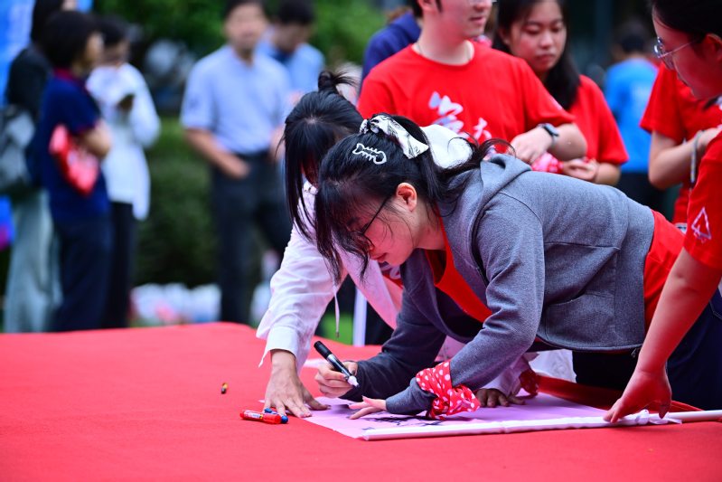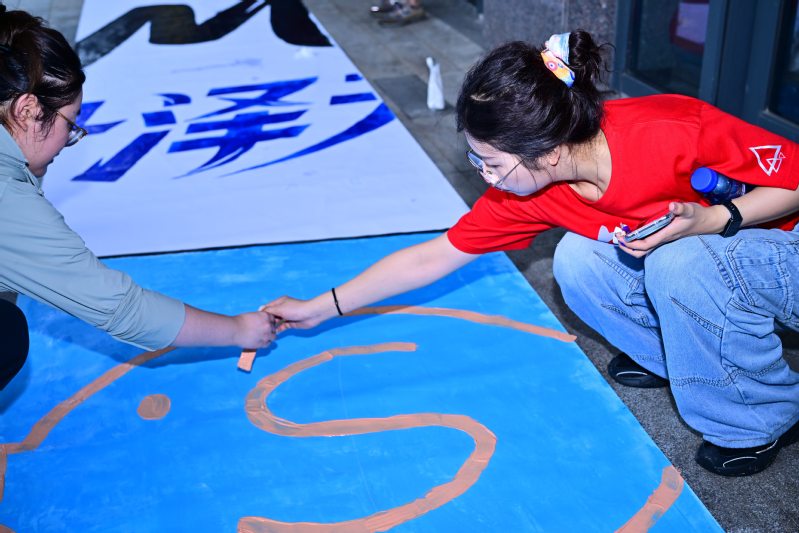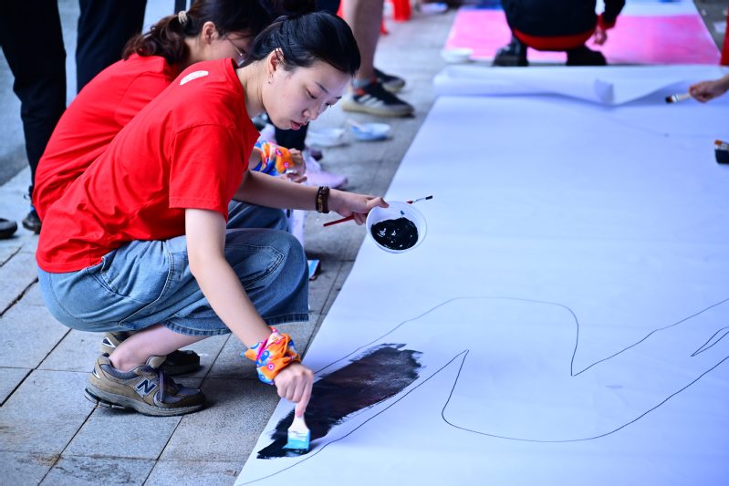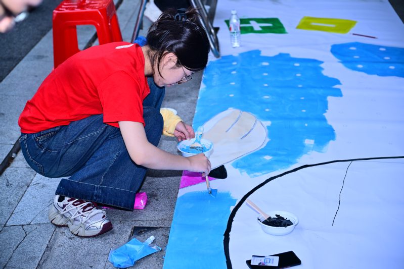 “共绘蓝图” 环节则迎来了一场意外的“小考验”。淅淅沥沥的小雨悄然洒落,但这丝毫没有浇灭同学们的热情。从整体设计构思、分区绘画创作,到各小组作品衔接、巨型画布拼接,每一个步骤都凝聚着团队的智慧与汗水。队员们始终坚守岗位,发挥各自创意,擅长绘画的同学精心勾勒线条,色彩敏感的同学调配和谐色调,最终将一幅幅分散的画作汇聚成一幅完整的巨型蓝图。这幅蓝图不仅是艺术创作的成果,更是团队精神的生动写照,它见证了同学们在挑战面前的坚持与担当,也诠释了团队协作的真谛。
