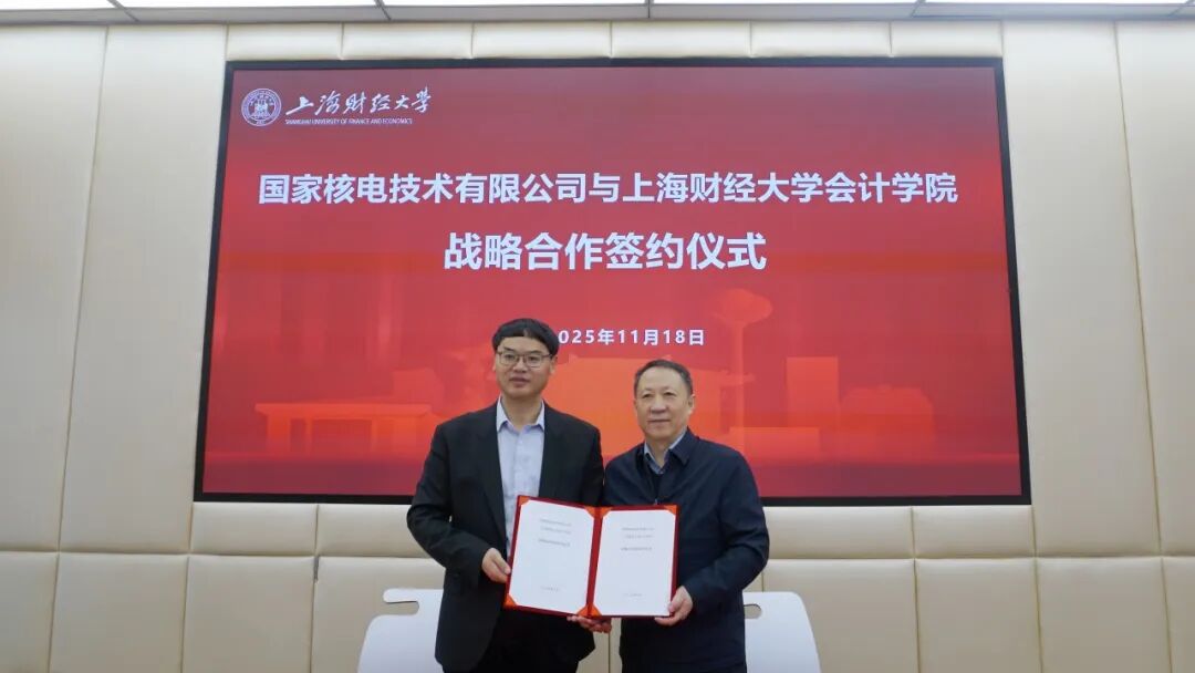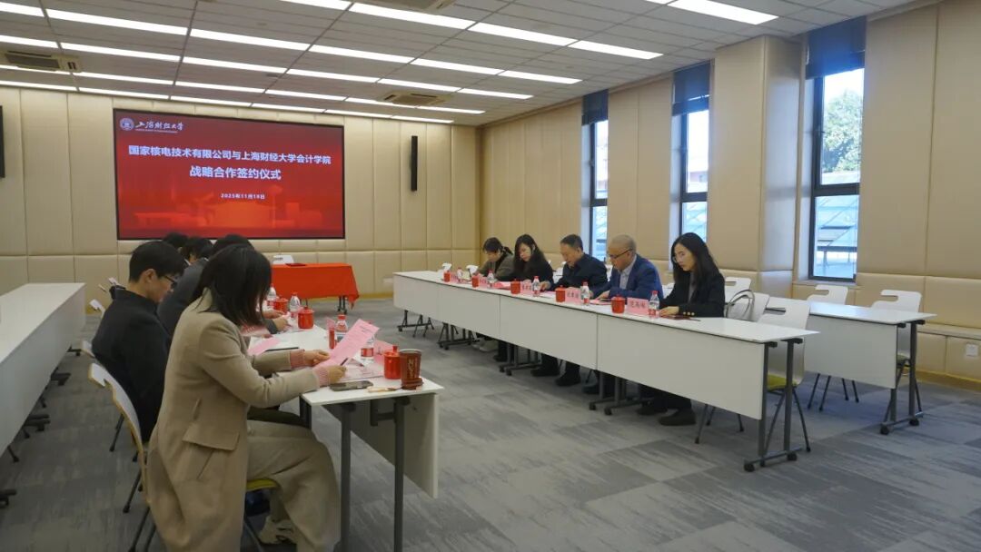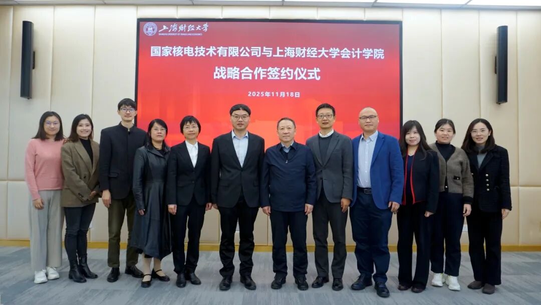 11月18日上午,国家核电技术有限公司(以下简称“国家核电”)与上海财经大学会计学院(以下简称“上财会院”)战略合作协议签约仪式在上海财经大学举行。国家核电副总经理、总会计师庞建国,财资部主任纪孝煊、财资部总监冷文欣;上海财经大学会计学院院长靳庆鲁、党委书记郑继红等领导出席仪式,双方相关部门负责同志参加活动。仪式由上财会院副院长唐松主持。