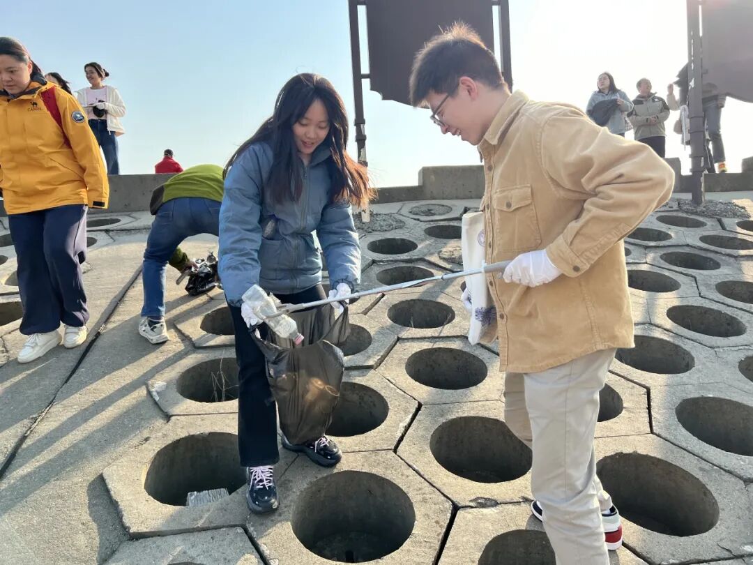 午后,师生一行前往横沙东滩湿地通海大堤,开展“净滩行动”。大家手持工具清理堤岸垃圾,以实际行动守护长江生态,将“共护长江生态、共筑海防长城、共卫家国安宁”的倡议转化为实践,深化了生态环保理念与家国责任意识。