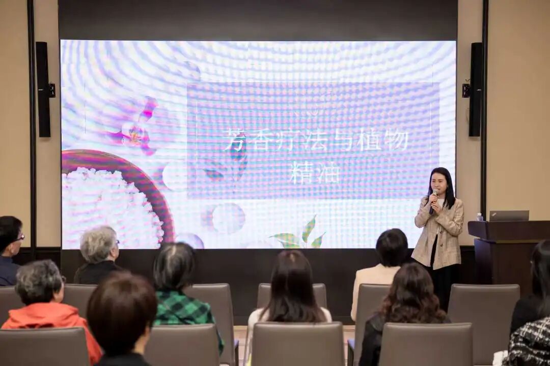 健康讲堂环节,汪阳首先代表校友会对各位老师的到来表示欢迎,并送上节日祝福。康养专家贺斌以“身体舒服、灵魂自在——献给女神们的优雅变老指南”为题开讲,结合实例为老教师们分享康养知识。随后,财务管理专业校友张莹主持的“芳香疗法与植物精油”沙龙,延续了活动的温情氛围,甜橙与薄荷的清新精油香气弥漫现场,通过引导大家现场嗅闻、示范按摩,详细讲解不同精油的舒缓功效与使用技巧。“不仅学会了实用的放松技巧,更真切感受到校友们的心意,这节‘芳香课’比任何礼物都珍贵。”退休教师们纷纷感慨。
