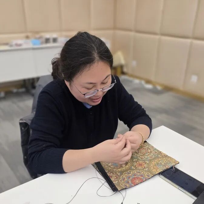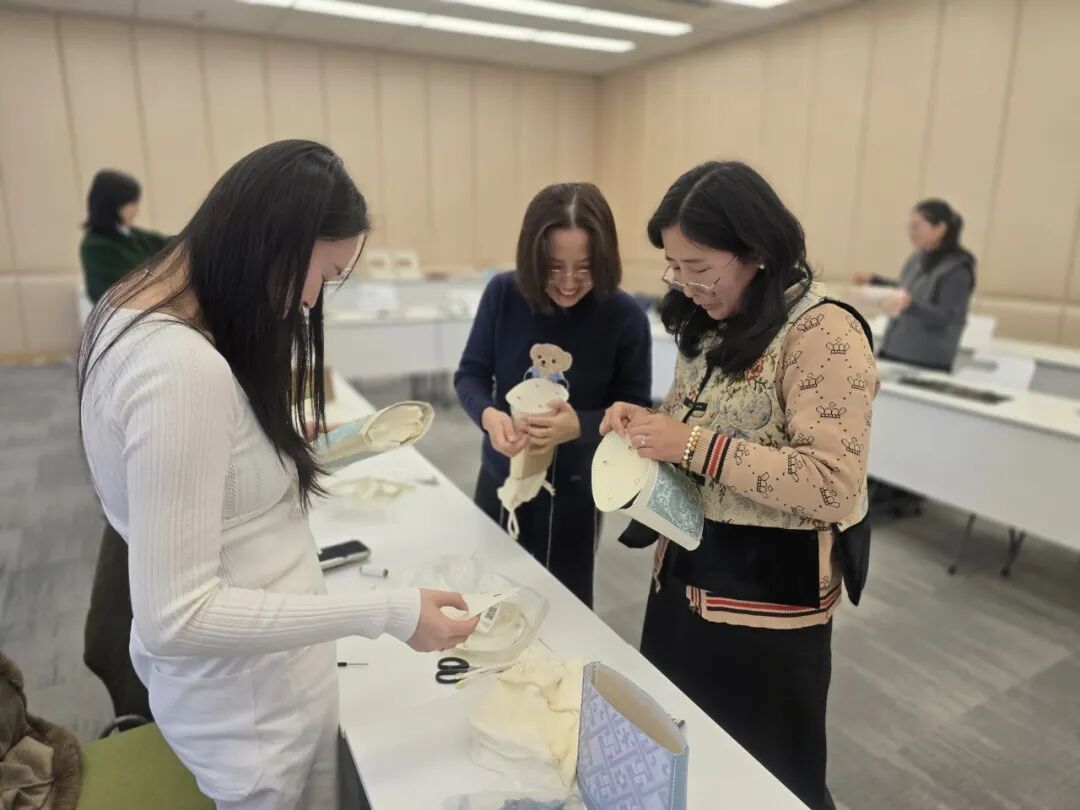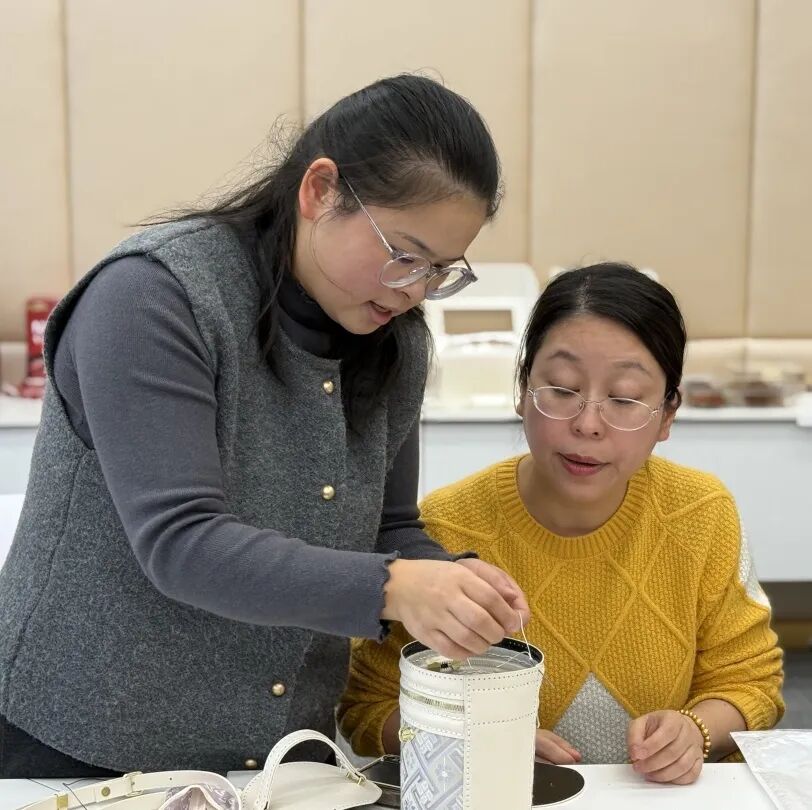 在老师的指导下,各位老师化身心灵手巧的“匠人”,或屏息凝神穿针引线,指尖翻飞间将丝线稳稳固定;或对着纹样比对位置,反复调整布料褶皱力求完美。阳光透过玻璃窗洒在锦面上,经纬交织的纹路折射出细碎光泽,老师们专注的眼眸相映成趣。