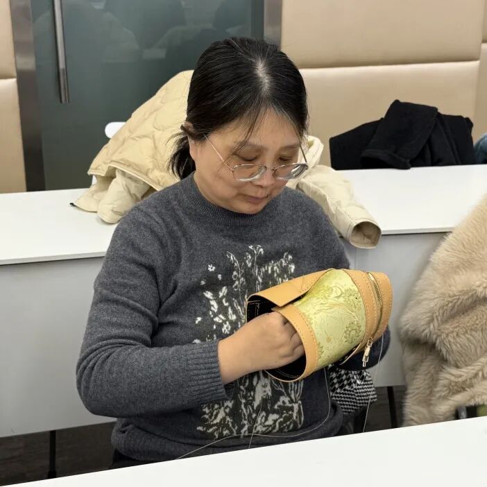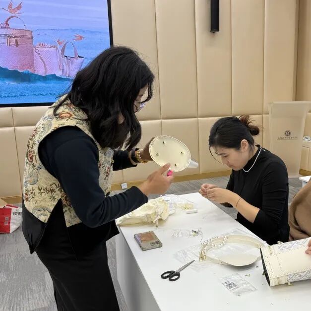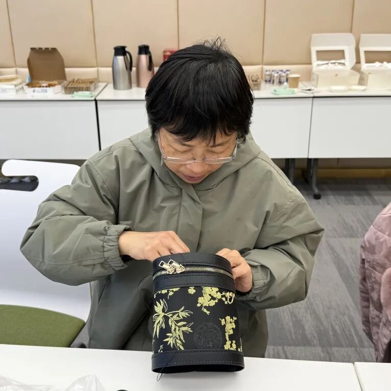 活动伊始,制作老师便为大家揭开了“中国四大名锦”之一——宋锦的神秘面纱。从历史渊源、织造纹样等娓娓道来,细腻的讲解搭配实物展示,让在场女教职工们直观感受到传统工艺的匠心与温度。桌上整齐摆放的湖蓝、朱红、米白等各色宋锦面料,搭配鎏金搭扣、流苏挂饰等配件,早已让大家跃跃欲试。