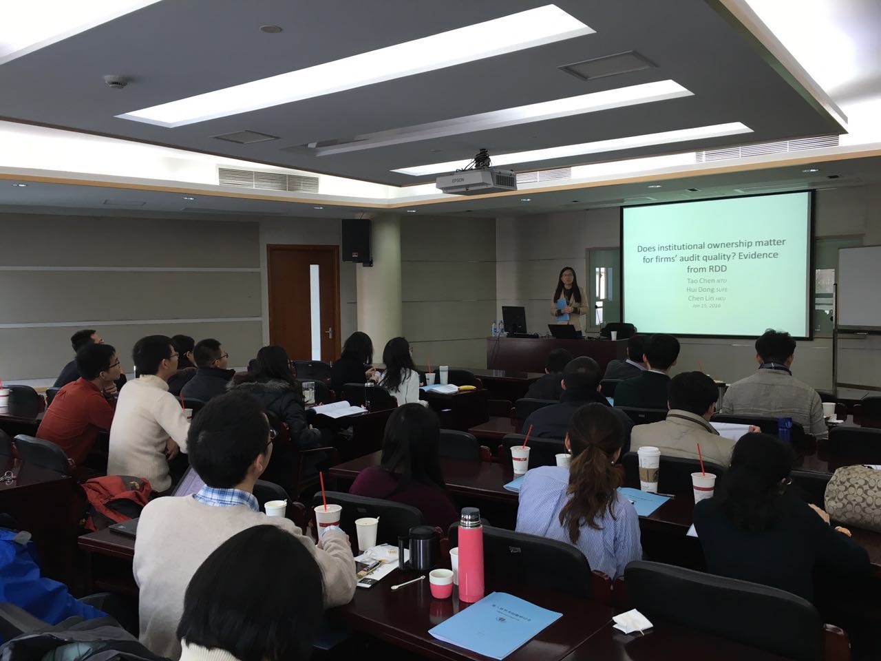 上海财经大学会计与财务研究院于2016年1月15日在本校成功召开了第八届学术创新研讨会。研讨会旨在就研究员最新的工作论文和研究计划进行学术讨论,目的是促进研究院产出高质量的学术成果。为此,会计学院院长李增泉教授、副院长靳庆鲁教授和院长助理朱凯教授分别主持了研讨会不同板块。与会期间,一名海外专家肯塔基大学谢宏教授参会。专家以其丰富的学术经验,对研究员的报告内容提出了建设性的学术评论建议。