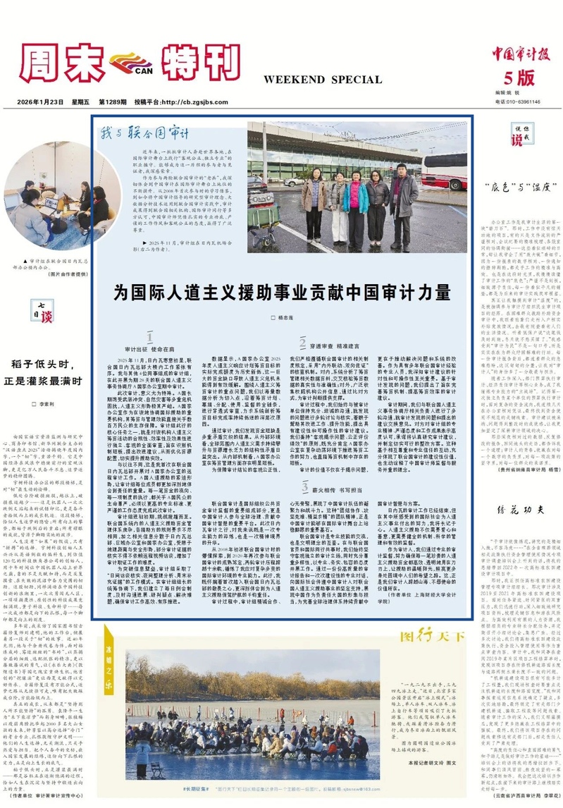 联合国审计是专业技能的交流,也是文明理念的互鉴。在与联合国官员和国际同行共事时,我们始终坚守客观独立的审计立场,同时充分尊重多样性,以专业、务实、包容的态度开展工作。通过一份份高质量的审计报告和一次次建设性的专业对话,向国际社会传递中国审计人对联合国人道主义援助事业的坚定支持,展现中国作为负责任大国的形象与担当,为完善全球治理体系持续贡献中国审计智慧与方案。