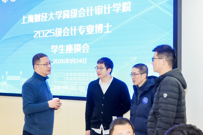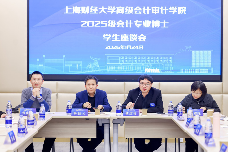 2026年1月24日课后,一场师生座谈会在上海财经大学举行。高级会计审计学院院长陈信元、会计学院院长靳庆鲁、郑继红书记及其他学院领导班子成员与2025级会计专博同学们共同与会。座谈会聚焦于本学期学业的回顾与总结,以及专业博士培养方案的规划与优化。会计学院、高级会计审计学院副院长曾庆生主持座谈并在开场时指出,会议核心在于全面了解学情、促进师生互动,从而为培养方案的完善提供依据。此番开场,为整场座谈奠定了“倾听与对话”的基调。
