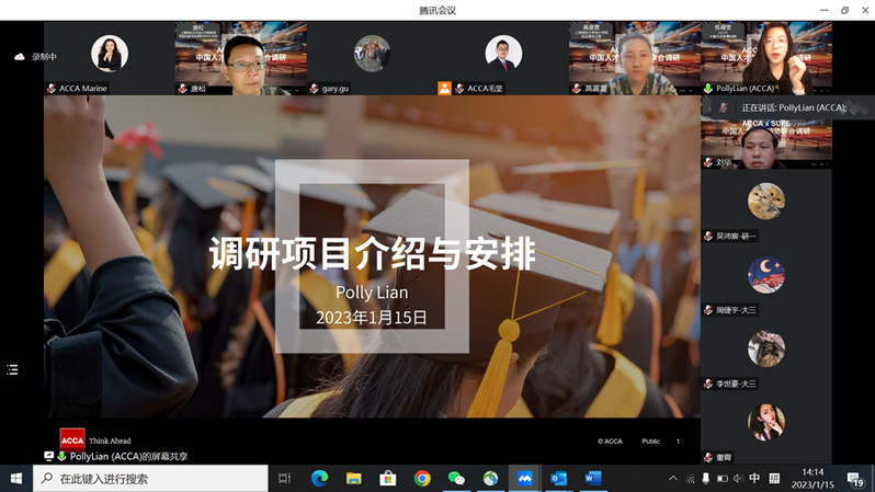 2023年1月15日,上海财经大学会计学院与特许公认会计师公会(ACCA)联合开展的《中国人才发展趋势报告》调研项目启动会在线举行。此次调研将以走访与深度访谈等形式,通过ACCA会员网络及上海财经大学校友网络,深入国有企业、民营企业和外资企业等不同类型行业和企业的财务团队第一线,探索中国会计师行业的工作变化,了解并追踪影响专业会计师的重要趋势。