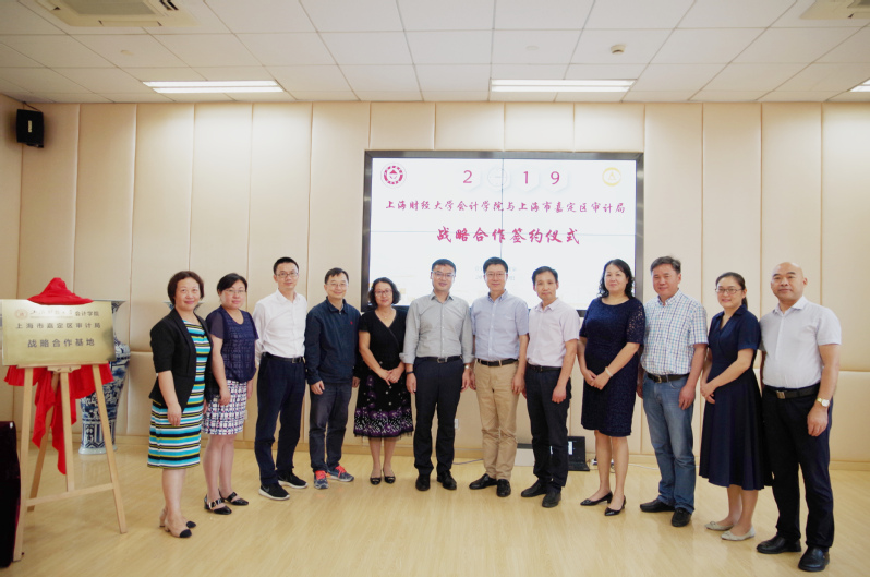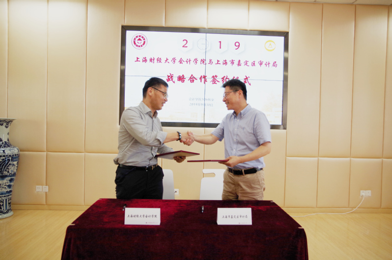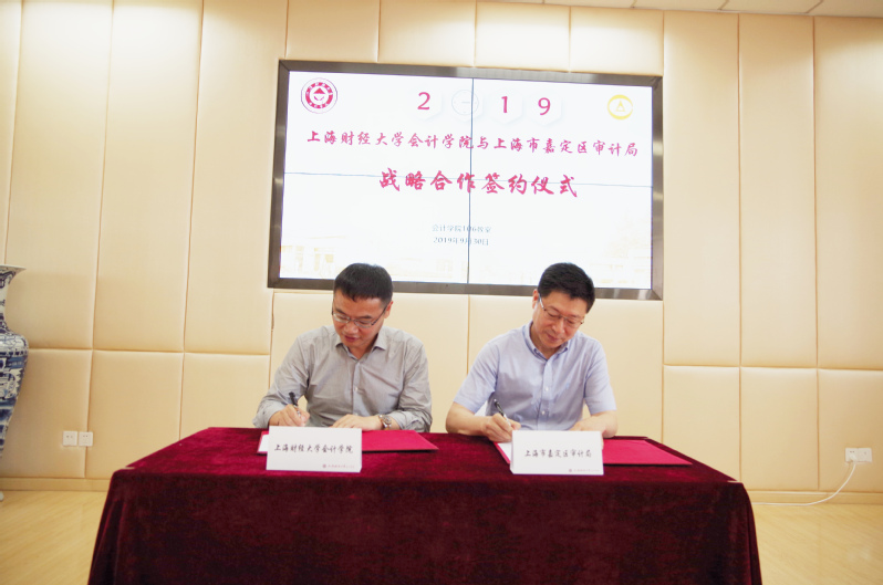 2019年9月30日下午13:30,上海财经大学会计学院与上海市嘉定区审计局在会计学院106室签署战略合作协议。上海市嘉定区审计局局长陆俊敏,书记韩忠顺,副局长徐青、刘东、管月霞,综合法规科科长张伟康,上海财经大学审计处处长杨忠莲,上海财经大学会计学院院长靳庆鲁,副院长朱凯、曾庆生,党委副书记黄莎,院办主任郜颂倩共同出席签约仪式。仪式由上海财经大学会计学院副院长朱凯主持。