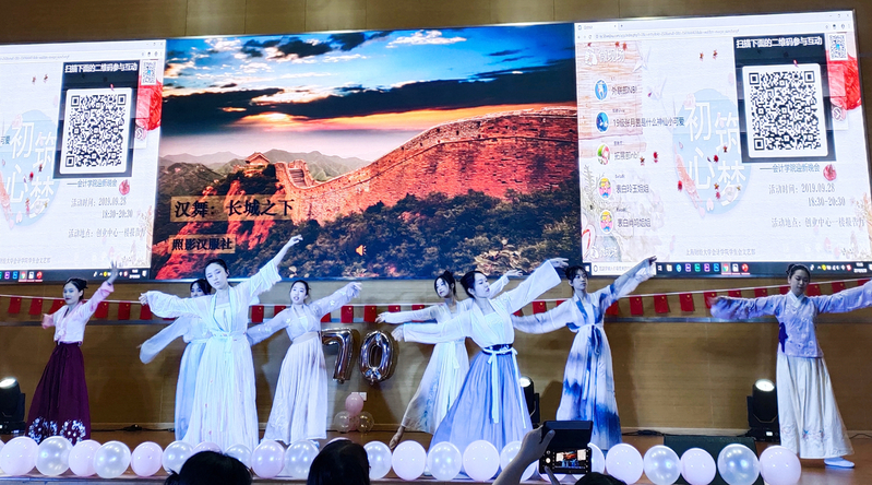 整场晚会共分为三个篇章。第一篇章为“筑梦之初”,既象征着新生们初入上财、梦想起航,也象征祖国建国之初的那段奋斗岁月。照影汉服社带来的汉舞表演《长城之下》,表达了长城之下勤劳勇敢的中华儿女,不忘初心、矢志不渝地追寻着中国梦;小提琴二重奏《梁祝》用琴弦再次演绎了中国传统音乐名曲;笑艺堂相声社的相声《漫谈上财》,用风趣幽默的方式,向新同学介绍财大校园,很好地带动了现场气氛。整个篇章以传统艺术为核心,蕴含祖国五千年的魅力。