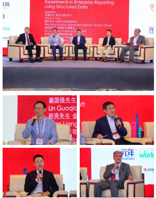 《使用标准化数据进行企业报告》圆桌论坛由普华永道合伙人李超主持。中国石化财务部处长魏东、普联软件董事长蔺国强、元年科技公司专家袁海东、金蝶集团副总裁赵亮对话圆桌论坛。
